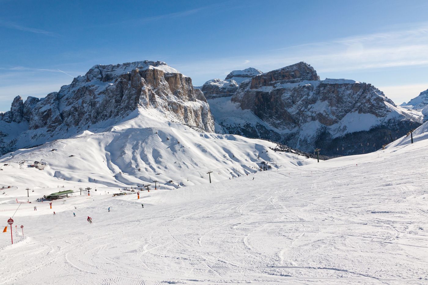 Die Sellaronda gegen den UhrzeigersinnDie legendäre Sellaronda lässt sich in zwei Richtungen befahren. Während die Runde im Uhrzeigersinn mit orangefarbenen Schildern gekennzeichnet ist, folgst du den grünen Schildern, um die Sellaronda gegen den Uhrzeigersinn zu fahren. An der Frage, welche Richtung schöner ist, scheiden sich die Geister. Viele Skifahrer finden die grüne Runde allerdings leichter als die orangefarbene. Die Sellaronda ist aus drei Gründen bemerkenswert: Erstens handelt es sich um eine Skirunde, die sich ausdrücklich nicht nur für erfahrene Skifahrer eignet. Zweitens ist die Qualität der Pisten ausgezeichnet. Drittens erwarten dich auf der Sellaronda einmalig schöne Aussichten auf die berühmtesten Dolomitengipfel.